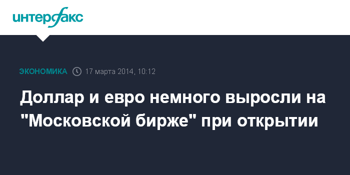 Москва. 17 марта. INTERFAX.RU - Доллар и евро немного выросли на "Московской бирже" в понедельник при открытии, рубль немного снизился по отношению к бивалютной корзине, которая остается в непосредственной близости от верхней границы коридора ЦБ РФ в условиях геополитической неопределенности.