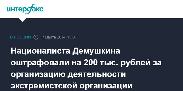 Москва. 17 марта. INTERFAX.RU - Мировой суд Останкинского района Москвы приговорил лидера националистического объединения "Русские" Дмитрия Демушкина к штрафу в размере 200 тыс. рублей по делу о деятельности запрещенного "Славянского союза", но освободил его от наказания в связи с истечением срока давности.