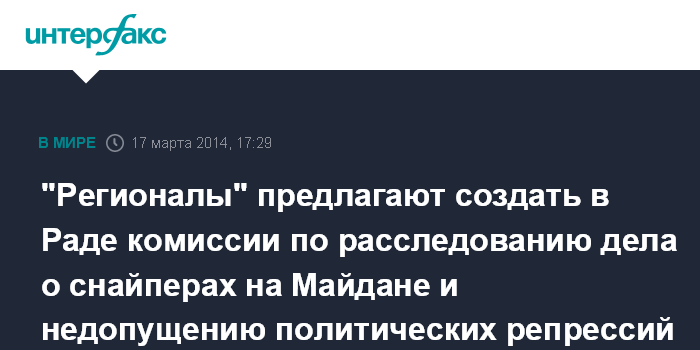 Москва. 17 марта. INTERFAX.RU - В Верховной раде Украины зарегистрирован проект постановления о создании временной следственной комиссии парламента по вопросам расследования обстоятельств расстрела из снайперского оружия участников беспорядков и правоохранителей во время массовых акций в Киеве.