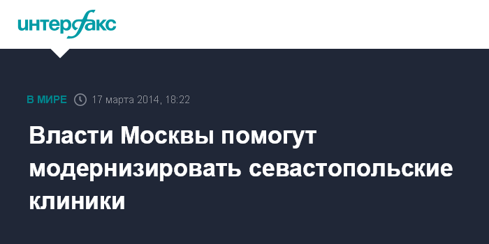 Москва. 17 марта. INTERFAX.RU - Правительство Москвы окажет помощь Севастополю в модернизации медицинских учреждений, сообщил мэр российской столицы Сергей Собянин в интервью телеканалу "Россия-24" в понедельник.