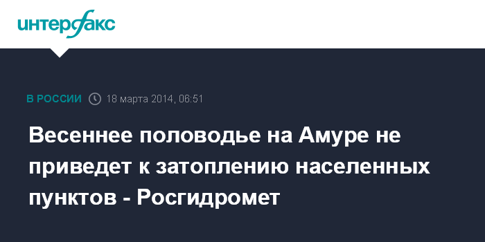 Владивосток. 18 марта. ИНТЕРФАКС - ДАЛЬНИЙ ВОСТОК - Росгидромет не прогнозирует экстремально высоких уровней воды в бассейне Амура во время паводка нынешней весной, сообщил руководитель организации Александр Фролов.