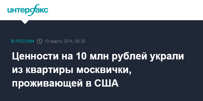 Москва. 18 марта. INTERFAX.RU - Квартиру москвички, живущей в США, обокрали на западе столицы, похитив ценностей на 10 млн рублей, сообщили "Интерфаксу" во вторник в пресс-службе ГУ МВД России по Москве.