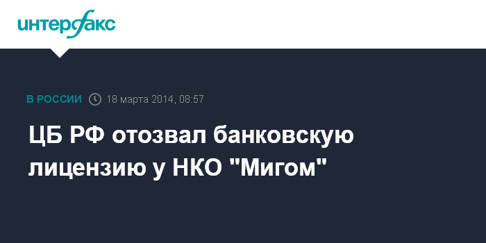 ЦБ РФ отозвал банковскую лицензию у НКО "Мигом"