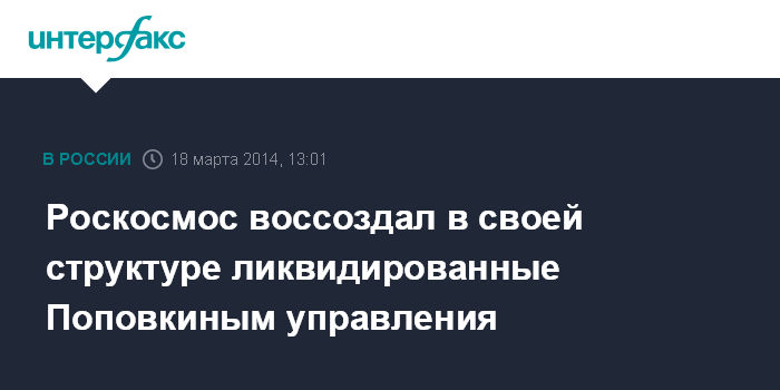 Москва. 18 марта. INTERFAX.RU - В структуре Роскосмоса воссозданы управления, в свое время закрытые экс-главой космического агентства Владимиром Поповкиным.