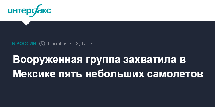 Мехико. 1 октября. INTERFAX.RU - В Мексике 20 вооруженных неизвестных захватили пять самолетов "Сесна", которые ранее были изъяты у предполагаемых наркоторговцев, сообщает местная полиция.