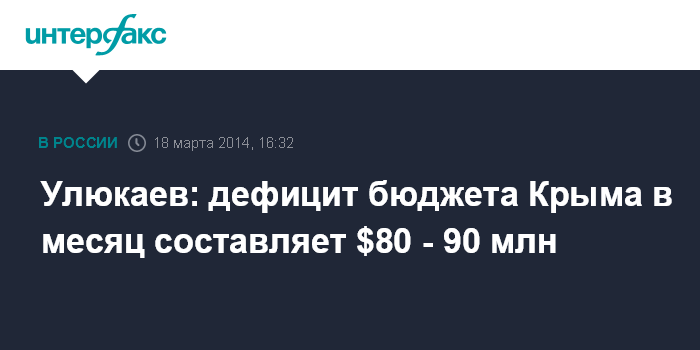 "Краткосрочные затраты более-менее понятны - они исходят из оценки бюджета Крыма и трансфертов, которые нужны, чтобы обеспечить его сбалансированность. Оценка месячного дефицита бюджета Крыма - порядка 80 - 90 млн долларов в месяц", - сказал Улюкаев журналистам по окончании обращения президента РФ к Федеральному собранию.