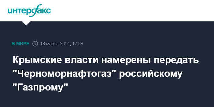Москва. 18 марта. INTERFAX.RU - Крымские власти намерены передать ГАО "Черноморнафтогаз" российскому "Газпрому", специалисты которого уже установили фактический контроль над предприятием, заявляет заместитель председателя правления "Черноморнафтогаза" Владимир Плечун.