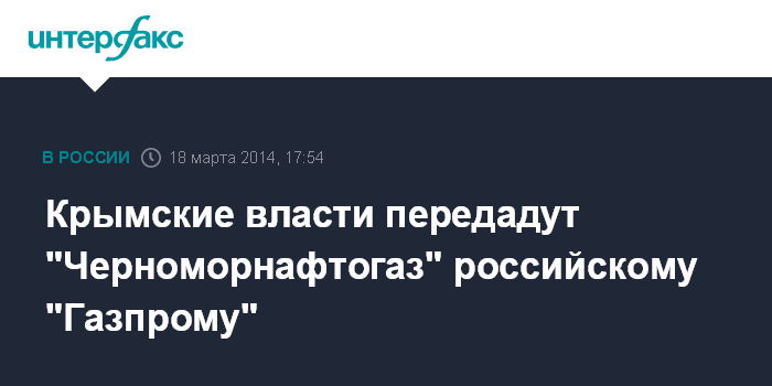 Москва. 18 марта. INTERFAX.RU - Крымские власти намерены передать ГАО "Черноморнафтогаз" российскому "Газпрому", специалисты которого уже установили фактический контроль над предприятием, заявляет заместитель председателя правления "Черноморнафтогаза" Владимир Плечун.