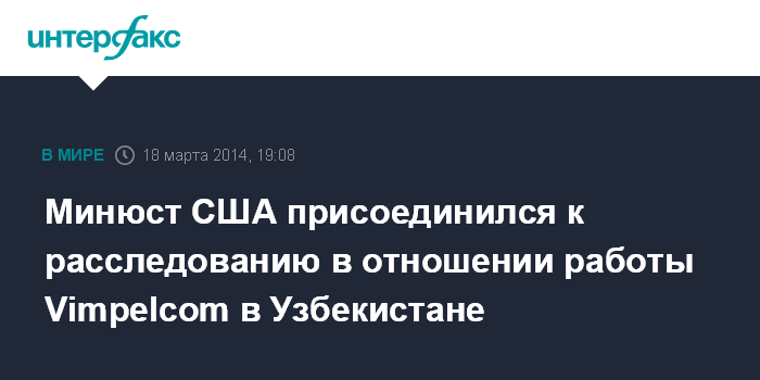 Москва. 18 марта. INTERFAX.RU - Министерство юстиции США, вслед за Комиссией по ценным бумагам и биржам США (SEC) и властями Нидерландов, начало расследование деятельности Vimpelcom Ltd в Узбекистане.