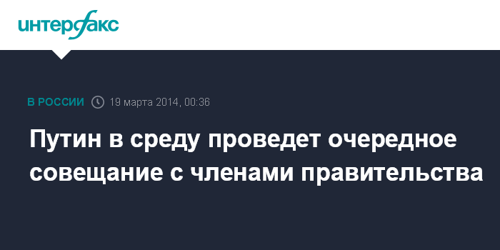 Москва. 19 марта. INTERFAX.RU - В среду, 19 марта состоится очередное совещание президента РФ Владимира Путина с членами правительства, посвященное ходу реализации задач, поставленных президентом в Послании Федеральному Собранию Российской Федерации в развитие майских (2012 г.) указов, сообщает пресс-служба Кремля.