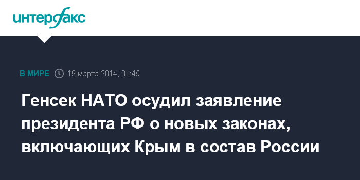 Брюссель. 19 марта. INTERFAX.RU - Генеральный секретарь НАТО Андерс Фог Расмуссен объявил, что осуждает заявление президента Путина о новых законах, включающих Крым в состав Российской Федерации.
