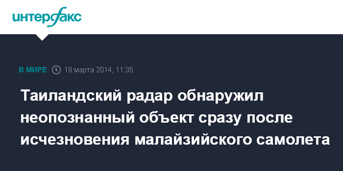 Москва. 19 марта. INTERFAX.RU - Таиландский радар обнаружил "неопознанное воздушное судно" через несколько минут после того, как самолет авиакомпании Malaysia Airlines передал последний сигнал о своем местонахождении, передает в среду сингапурский телеканал Channel News Asia.