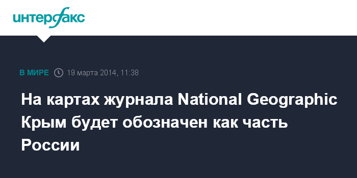 Москва. 19 марта. INTERFAX.RU - Журнал National Geographic обозначит на своих картах Крым как территорию Российской Федерации, сообщает в среду агентство Bloomberg.