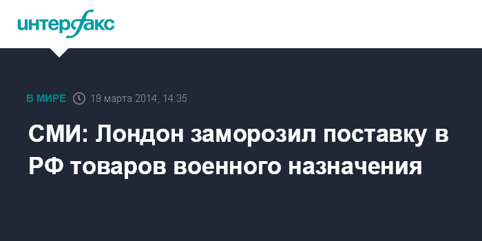 Москва. 19 марта. INTERFAX.RU - Великобритания приостановила действие разрешений на поставку в Россию товаров военного назначения на сумму около 86 млн фунтов стерлингов, сообщила в среду BBC.