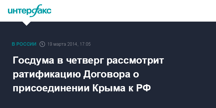 Москва. 19 марта. INTERFAX.RU - Госдума проголосовала за проведение дополнительного заседания в четверг в 16 часов для рассмотрения ратификации Договора о присоединении Крыма к РФ и принятия федерального конституционного закона об образовании двух новых субъектов РФ - Крыма и Севастополя.