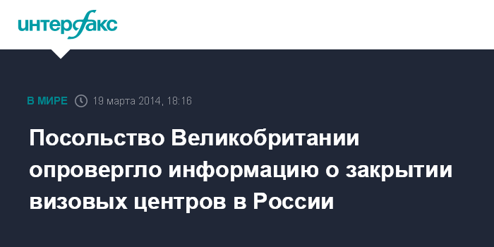 Москва. 19 марта. INTERFAX.RU - В посольстве Великобритании опровергли информацию о якобы имеющихся планах закрытия визовых центров по всей России, отметив, что изменения в их работе будут, но никак не относящиеся к политике.
