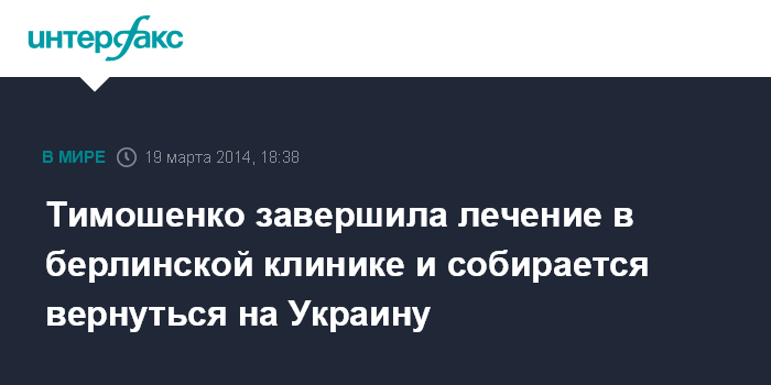 Берлин. 19 марта. INTERFAX.RU - Экс-премьер Украины Юлия Тимошенко завершила курс лечения в берлинской клинике "Шарите" и планирует вернуться на родину, сообщило в среду агентство AP.