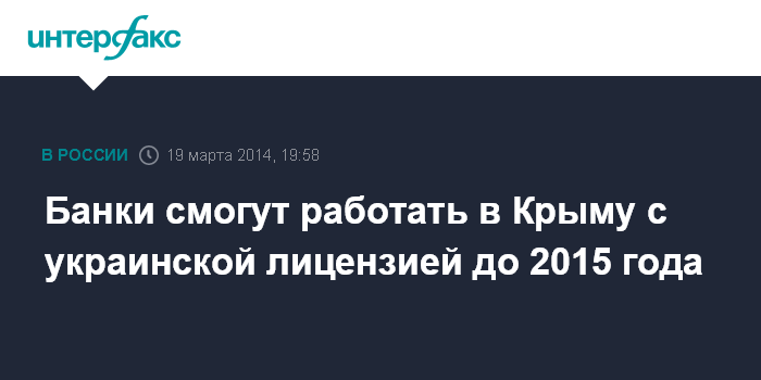 Москва. 19 марта. INTERFAX.RU - Банки смогут работать в Крыму и Севастополе с лицензией, выданной украинским регулятором, до 1 января 2015 года, следует из законопроекта "О принятии в РФ Республики Крым и образовании в составе РФ новых субъектов - Республики Крым и города федерального значения Севастополя", внесенного в Госдуму.