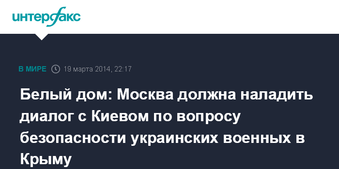 Москва. 19 марта. INTERFAX.RU - США призывают Россию приступить к переговорам с властями Украины по вопросу обеспечения безопасности украинских военных в Крыму, заявил в среду представитель Белого дома Джей Карни.