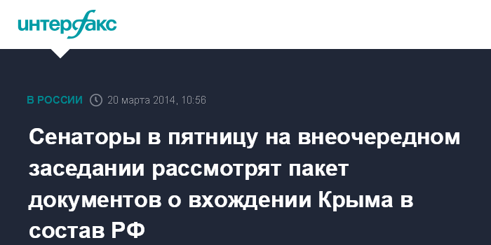 Сенаторы в пятницу на внеочередном заседании рассмотрят пакет документов о вхождении Крыма в состав РФ