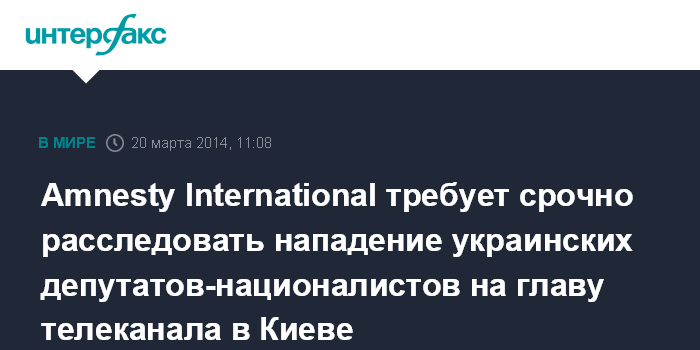 Москва. 20 марта. INTERFAX.RU - Правозащитная организация Amnesty International требует расследовать нападение в Киеве депутатов от украинской партии "Свобода" на врио руководителя Национальной телекомпании Украины Александра Пантелеймонова.