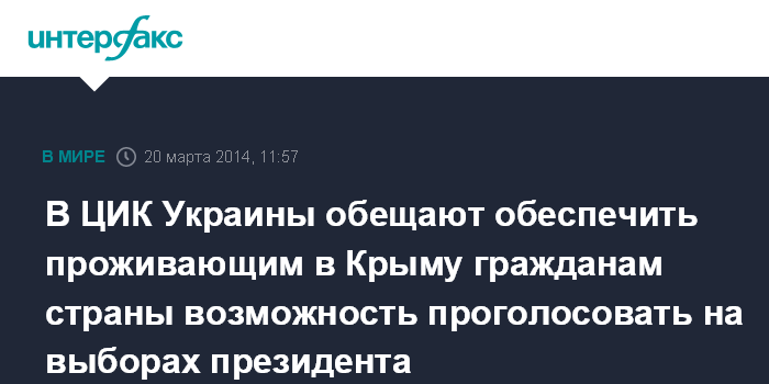 Москва. 20 марта. INTERFAX.RU - Верховная рада Украины должна обеспечить реализацию избирательных прав на президентских выборах гражданам Украины, проживающим на территории Крыма, считает председатель Центральной избирательной комиссии Украины Михаил Охендовский.