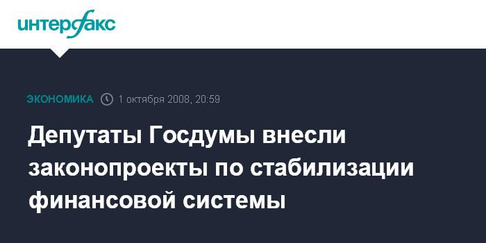 Москва. 1 октября. INTERFAX.RU - Депутаты Госдумы внесли блок законопроектов о дополнительных мерах, направленных на стабилизацию финансовой системы РФ, сообщил журналистам один из авторов законопроектов, председатель Госдумы по финансовому рынку Владислав Резник.