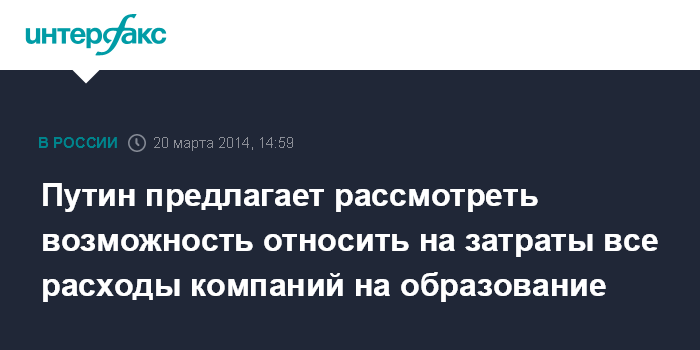 Москва. 20 марта. INTERFAX.RU - Президент РФ Владимир Путин предлагает рассмотреть возможность относить на затраты все расходы компаний на образование.
