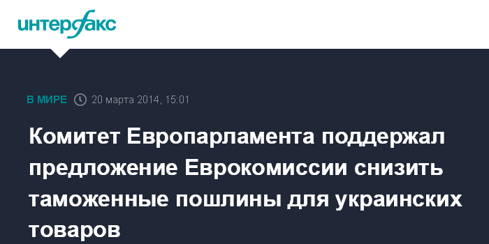 Москва. 20 марта. INTERFAX.RU - Профильный комитет Европейского парламента поддержал предложение Европейской комиссии снизить таможенные пошлины для украинских товаров.
