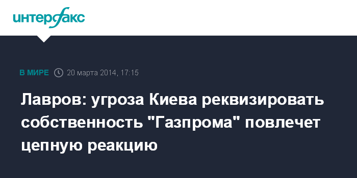 Москва. 20 марта. INTERFAX.RU - Угрозы нынешних властей Украины завладеть российской собственностью, в том числе собственностью "Газпрома", могут повлечь цепную реакцию, от которой Украина не выиграет, заявил глава МИД РФ Сергей Лавров.