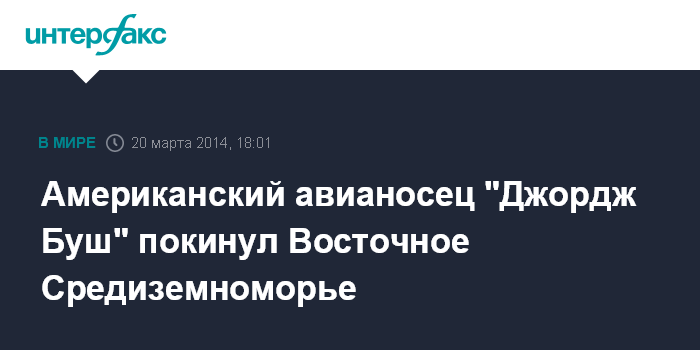 Вашингтон. 20 марта. INTERFAX.RU - Американская авианосная ударная группа в составе атомного авианосца "Джордж Буш" и кораблей боевого охранения покинула Восточное Средиземноморье, где по пути на Ближний Восток она задержалась из-за ситуации на Украине.