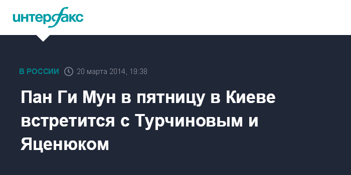 "Завтра я посещу Киев, встречусь с исполняющим обязанности президента Турчиновым и премьер-министром Яценюком, а также другими официальными лицами и представителями организаций гражданского общества", - сказал Пан Ги Мун после переговоров с президентом РФ Владимиром Путиным.