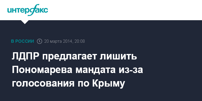 Москва. 20 марта. INTERFAX.RU - ЛДПР выступает за лишение члена фракции "Справедливая Россия" Ильи Пономарева депутатского мандата за то, что он в четверг не проголосовал за присоединение Крыма к России.