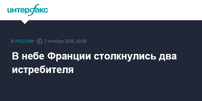 Москва. 2 октября. ИНТЕРФАКС - Два истребителя французских ВМС столкнулись и рухнули в море, один пилот обнаружен живым, поиски второго продолжаются, передает телеканал "Вести-24".