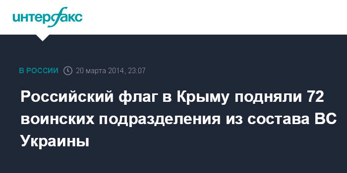 Москва. 20 марта. INTERFAX.RU - 72 воинских подразделения и учреждения из состава вооруженных сил Украины, дислоцированных на Крымском полуострове, в числе которых 25 судов вспомогательного флота и 6 боевых кораблей ВМСУ, подняли флаг Российской Федерации.