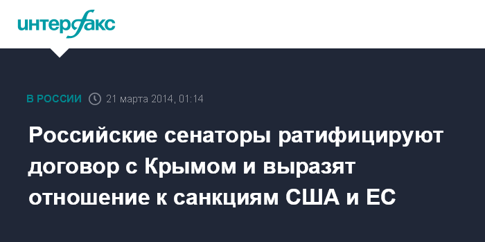 Российские сенаторы ратифицируют договор с Крымом и выразят отношение к санкциям США и ЕС