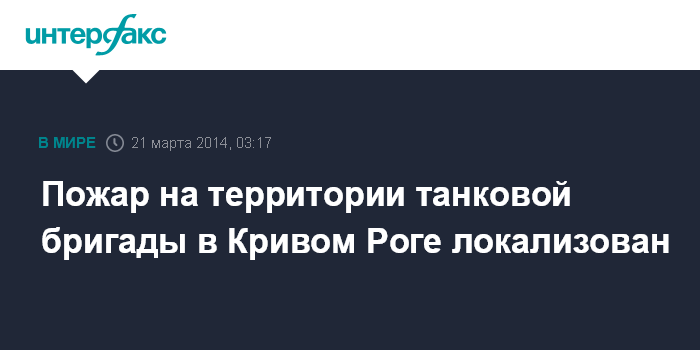 Днепропетровск. 21 марта. ИНТЕРФАКС-УКРАИНА - Пожар в городе Кривой Рог Днепропетровской области в расположении 17-й танковой бригады, где в одном из боксов загорелся танк, локализован в 22:30 (00:30 мск в пятницу).