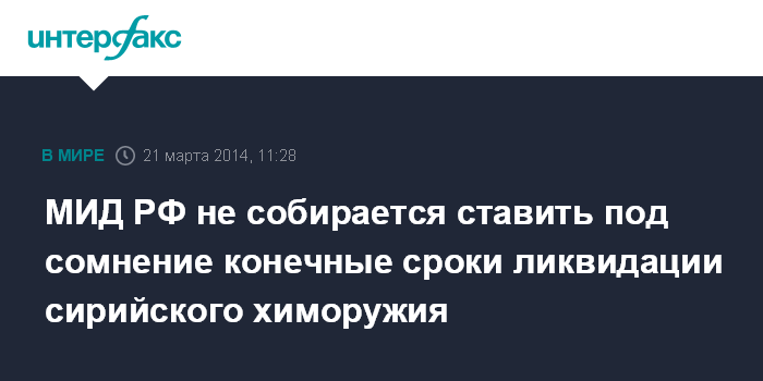 Москва. 21 марта. INTERFAX.RU - Нет никаких оснований ставить под сомнение конечные сроки уничтожения сирийского химоружия, убеждены в Москве.