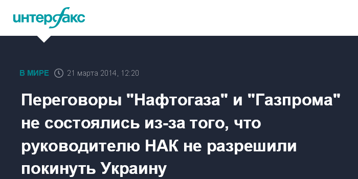Москва. 21 марта. INTERFAX.RU - Запланированные на 20-21 марта между НАК "Нафтогаз Украины" и ОАО "Газпром" переговоры сорвались в последний момент, сообщил агентству "Интерфакс-Украина" источник в украинском правительстве.