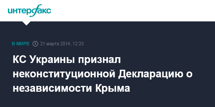 Москва. 21 марта. INTERFAX.RU - Конституционный суд Украины признал неконституционным постановление Верховного Совета Автономной республики Крым "О Декларации о независимости Автономной Республики Крым и города Севастополя" от 11 марта 2014 года.