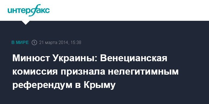 Москва. 21 марта. INTERFAX.RU - Венецианская комиссия в пятницу приняла решение, которым признал нелегитимным референдум в Крыму, поскольку он нарушает, кроме Конституции Украины, еще и базовые принципы территориальной целостности и суверенитета субъектов международного права, сообщил министр юстиции Украины Павел Петренко.