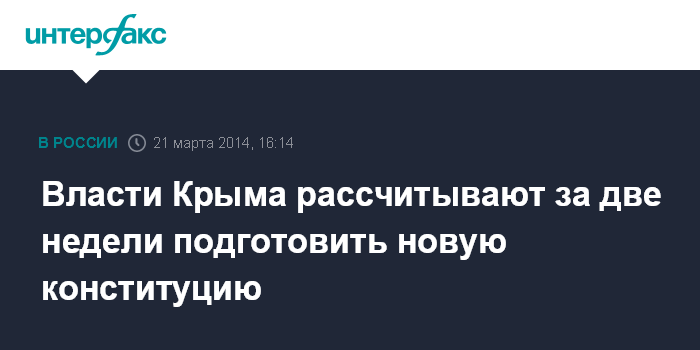 Агентство "Крыминформ" сообщает со ссылкой на Владимира Константинова, что подготовка проекта может завершиться через две недели. "Работа по подготовке конституции Республики Крым, надеюсь, завершится через две недели. В процессе создания будут задействованы специалисты из Российской Федерации, и, уверен, в ближайшее время мы утвердим проект конституции", - сказал Константинов.