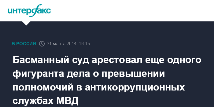 Москва. 21 марта. INTERFAX.RU - Басманный суд Москвы арестовал еще одного фигуранта дела о превышении должностных полномочий в антикоррупционном подразделении МВД РФ, замначальника одного из отделов управления "Б" (борьба с хищениями в бюджетной сфере) Евгения Шерманова. Он арестован до 20 мая.