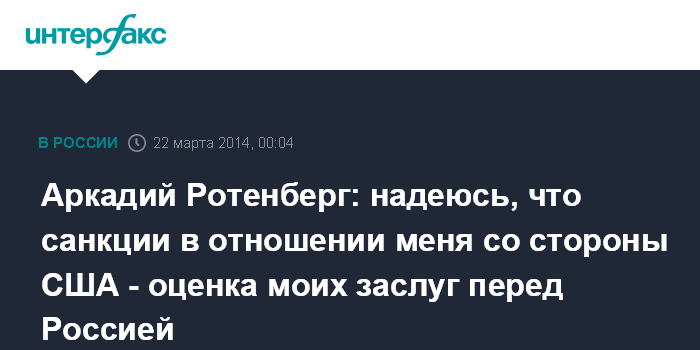 Москва. 22 марта. INTERFAX.RU - Известный российский бизнесмен Аркадий Ротенберг считает, что санкции против него со стороны США являются оценкой его деятельности во благо России.
