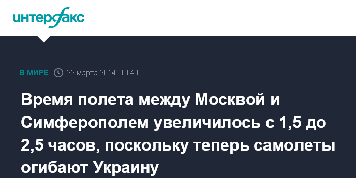 Время полета между Москвой и Симферополем увеличилось с 1,5 до 2,5 часов, поскольку теперь самолеты огибают Украину