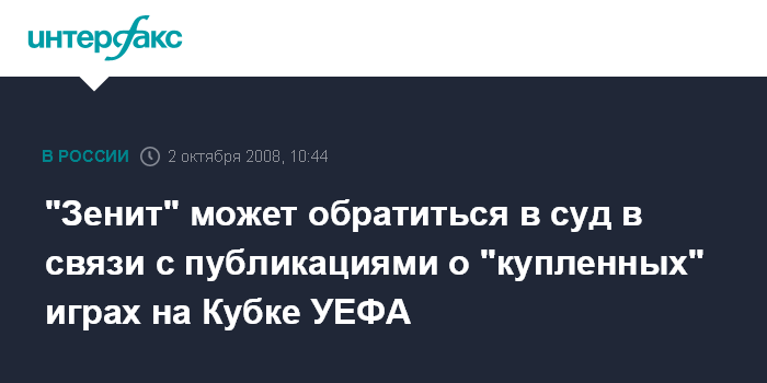 Санкт-Петербург. 2 октября. INTERFAX.RU - ФК "Зенит" считает публикации испанской прессы о якобы купленных играх Кубка УЕФА с "Баварией" и "Глазго Рефнджерс" оскорбляющими репутацию всех трех клубов и рассматривает возможность судебных исков.