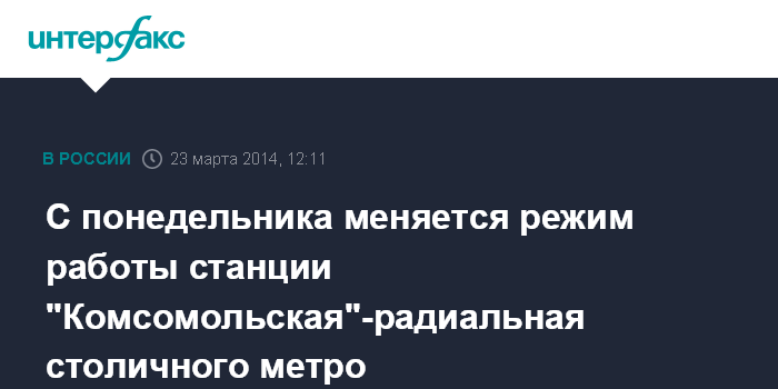 Москва. 23 марта. INTERFAX.RU - В связи с проведением работ по реконструкции подземных переходов Казанского вокзала с 24 марта изменяется режим работы южного вестибюля станции "Комсомольская" Сокольнической линии, сообщили "Интерфаксу" в пресс-службе столичного метрополитена. "Ежедневно с начала работы метрополитена до 10:30 по подземному переходу из южного вестибюля станции "Комсомольская"-радиальная нельзя будет пройти в здание Казанского вокзала, а с 17:00 до 20:30 будет закрыт проход в южный вестибюль станции "Комсомольская"-радиальная по подземному переходу из здания Казанского вокзала", - сказал собеседник агентства.
