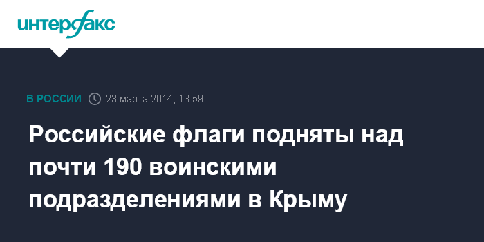 Москва. 23 марта. INTERFAX.RU - Флаги Российской Федерации по состоянию на 22 марта подняты в 189 воинских подразделениях и учреждениях вооруженных сил Украины, дислоцированных на территории Крыма, сообщили "Интерфаксу" в воскресенье в Минобороны РФ. "В данных гарнизонах в торжественной обстановке прошли построения личного состава с церемонией поднятия государственного флага Российской Федерации и исполнения гимна России", - отмечается в сообщении.