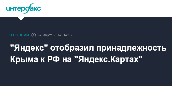 Москва. 24 марта. INTERFAX.RU - Интернет-поисковик "Яндекс" изменил на своем картографическом сервисе "Яндекс.Карты" отображение государственной принадлежности Крыма, который теперь показывается в составе РФ, говорится в сообщении компании.