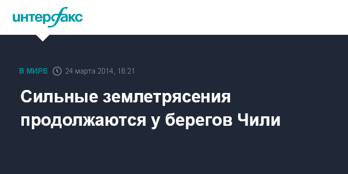 Москва. 24 марта. INTERFAX.RU - Еще два землетрясения магнитудой 5,8 и 6 зафиксированы у берегов Чили в понедельник, сообщает Геофизическая служба СО РАН.
